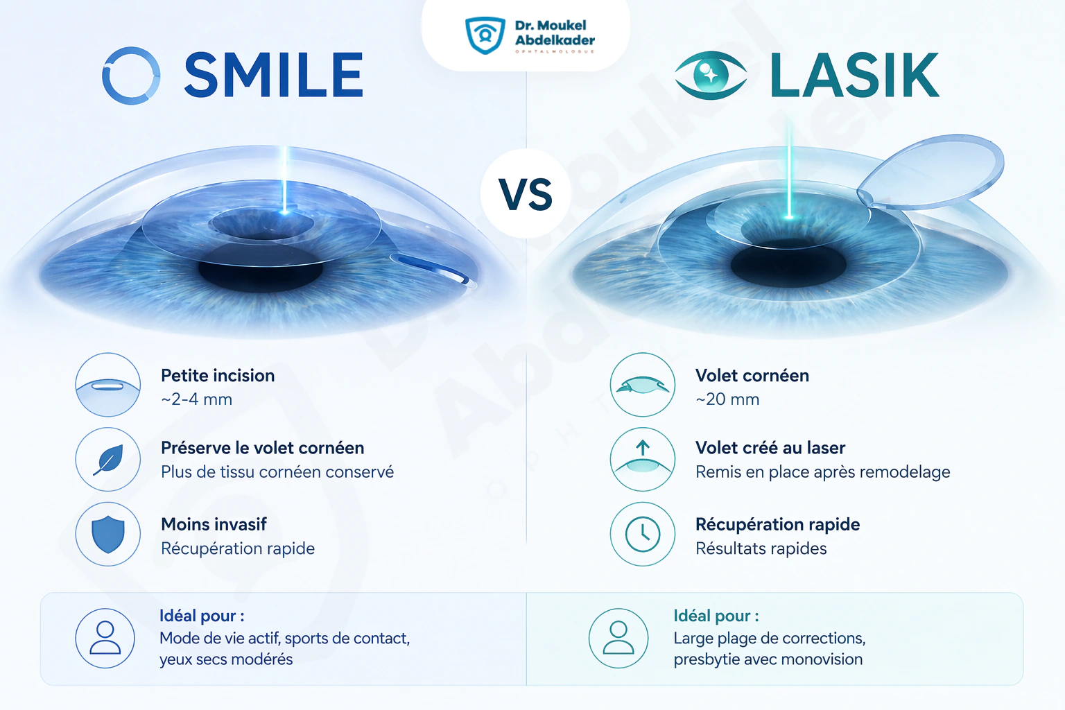 La comparaison entre SMILE et LASIK revient souvent dès qu'on envisage une chirurgie réfractive. Ces deux techniques permettent de corriger certains défauts visuels comme la myopie ou l'astigmatisme, mais elles ne s'adressent pas aux mêmes profils et ne se ressemblent pas dans leur approche. Avant de se demander laquelle est "la meilleure", il est plus utile de comprendre ce qui les distingue, dans quel contexte chacune peut être proposée, et pourquoi seule une évaluation médicale personnalisée permet de trancher. Ce guide a pour objectif d'y voir plus clair, sereinement.